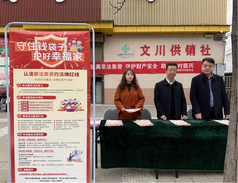 为深入贯彻落实防范非法集资工作要求,切实提升基层群众金融风险防范意识,守护人民群众财产安全,营造“全民防非、主动拒非”的良好社会氛围,2月27日上午,城固县供销合作社联合文川镇人民政府,在文川镇组织开展了以“远离非法集资,守护财产安全,助力乡村振兴”为主题的防范非法集资集中宣传活动。文川镇人民政府分管领导,县供销社领导及工作人员,文川供销社、文川供销社综合为农服务中心工作人员,供销实业公司工作人员参与本次活动。